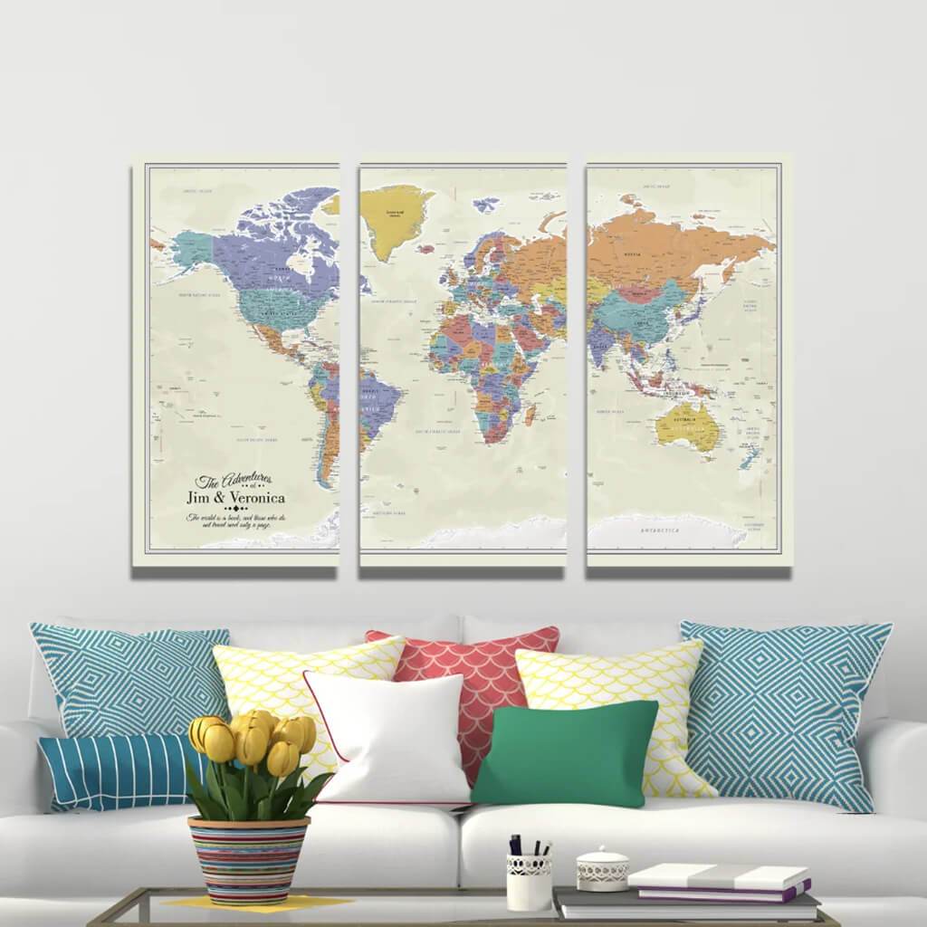 Three Panel World Travel Map | Large Canvas World Map Push Pin